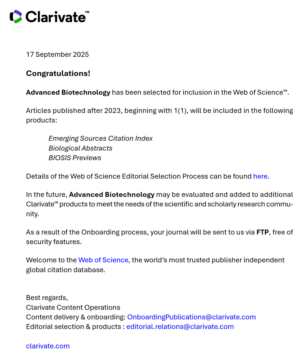 2025年9月19日,Advanced Biotechnology 顺利通过科睿唯安(Clarivate)评估,正式被Emerging Sources Citation Index (ESCI)、Biological Abstacts、BIOSIS Previews三项数据库收录。这是Advanced Biotechnology 继PubMed Central、CAS等数据库收录后,发展历程中一个具有里程碑意义的重要时刻。