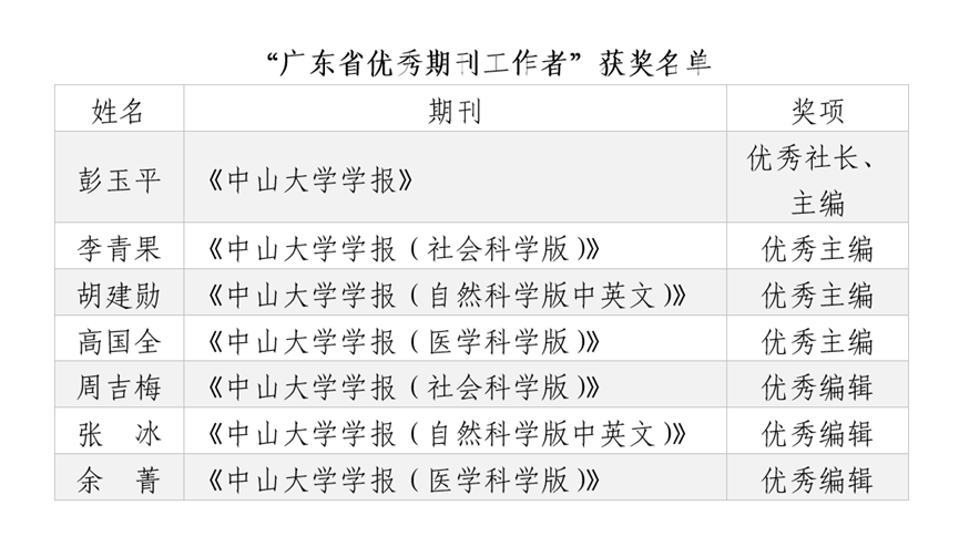 2025年9月16日,广东省期刊协会第八届第三次会员代表大会在广州召开,会上举行广东省优秀期刊工作者评优活动颁奖仪式,中山大学学报编辑部共有7人获评“广东省优秀期刊工作者”。