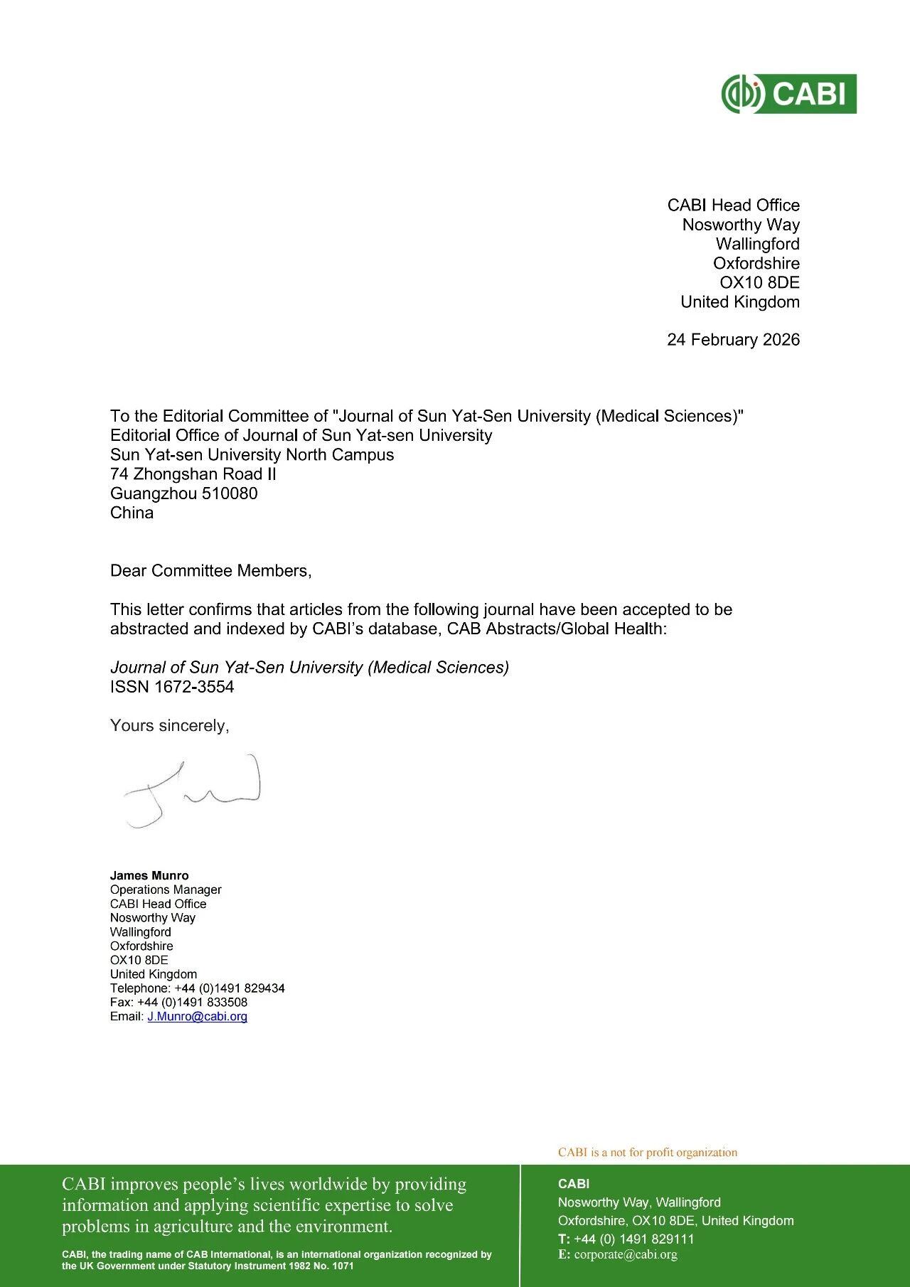 2026年2月24日,《中山大学学报(医学科学版)》经英国国际农业与生物科学中心(Center for Agriculture and Bioscience International,CABI)的严格审定,被正式收录至CABI数据库。